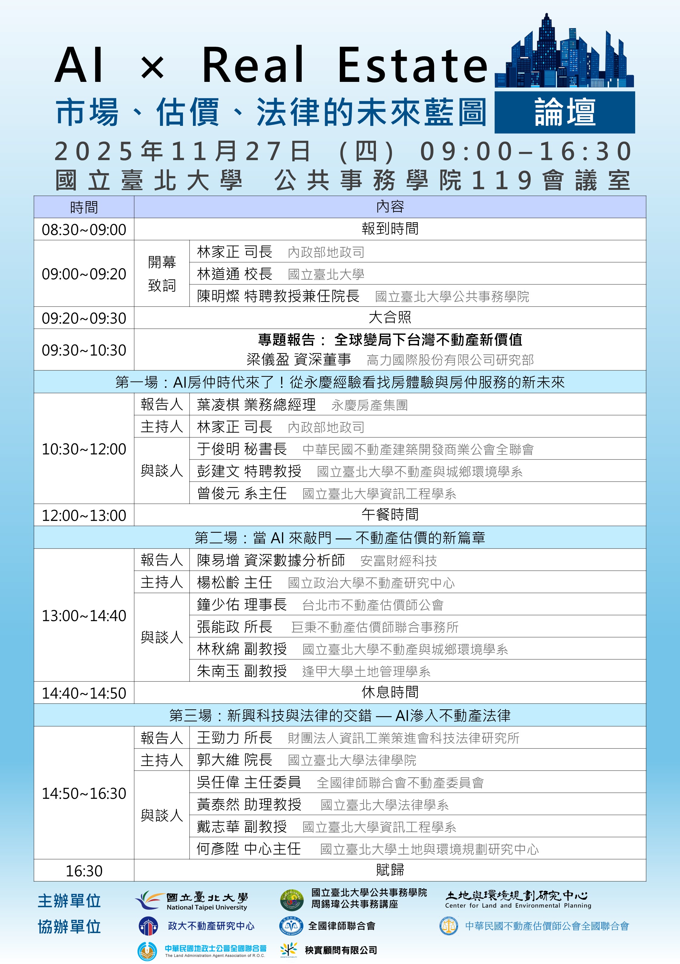 由國立臺北大學土地與環境規劃研究中心主辦, 國立政治大學不動產研究中心、中華民國地政士公會全國聯合會、中華民國不動產估價師公會全國聯合會、全國律師聯合會、秧實顧問有限公司 協辦,匯聚產、官、學界的專家與實務領袖,聚焦AI、大數據等科技在不動產市場、估價與法律領域的創新應用。